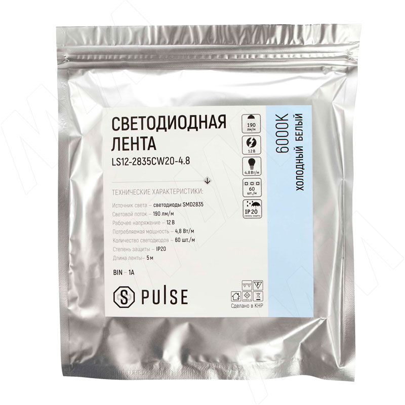 Лента светодиодная 2835/60, 12V, 5 м, холодный белый 6000К, IP20, 4.8W/1м